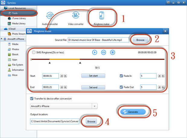Paso 5: Comienzan a hacer iPhone tono de llamada. Si desea transferir salida ringtone a tu iPhone automáticamente, simplemente puede comprobar la opción: transferencia al dispositivo después de la conversión y seleccionar tu iPhone en la lista desplegable. Si todo está bien, simplemente haz clic en el botón de generar, luego Syncios iPhone Ringtone Maker empezará a hacer tu tono de llamada iPhone personal rápidamente. Conversión de tono de llamada iPhone
