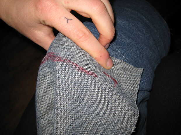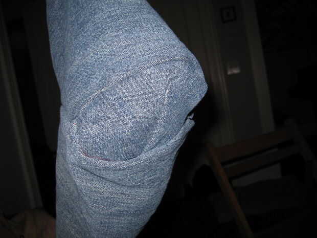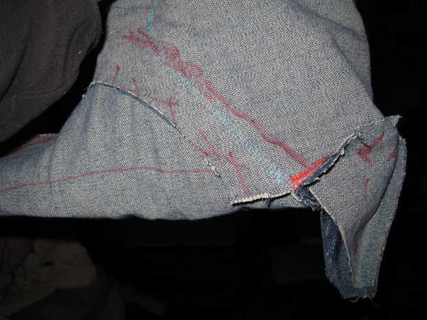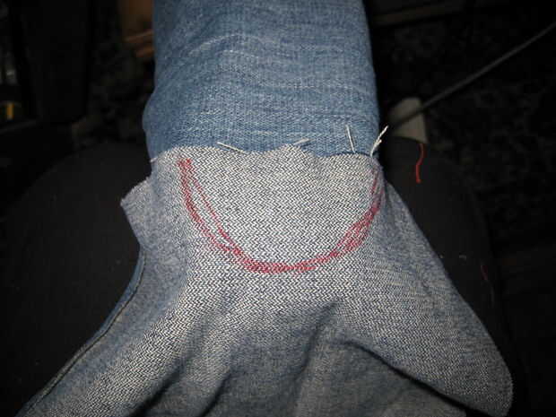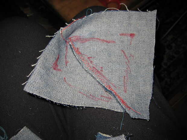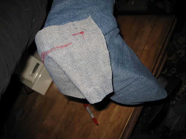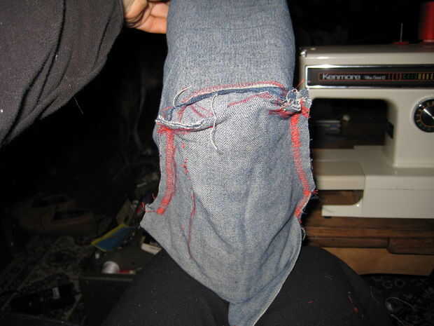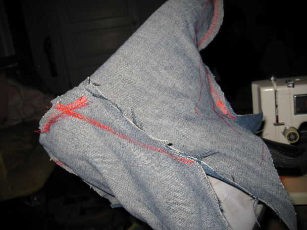 Derecha: tenemos las piezas de pie y tobillo-becerro hechas, que nos deja con un agujero en el talón (tela inferior no era lo suficientemente larga para llegar hasta el talón). Así que necesitamos parchear en una plaza.