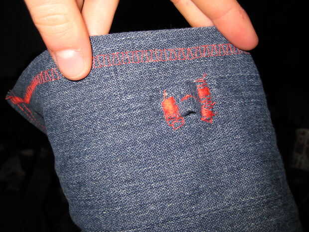 El agujero de cordón enfrenta a la dirección equivocada, pero por lo menos el cordón de zapato no cae como con el orificio horizontal hecho a continuación.
