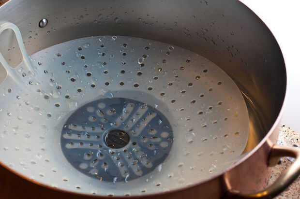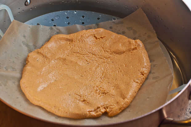 Establecer un vapor. Tengo un pequeño vapor de silicio que encaja en mi olla de sopa más grande. Vierta aproximadamente una pulgada de agua en la olla y el vapor en la olla. Coloque la masa aplanada en un cuadrado de papel de pergamino que se ajuste en la parte superior el vapor. Baje suavemente sobre el vapor, tratando de no agua en él. Cubrir la olla, poner agua a hervir, bajar el fuego y hierva a fuego lento durante 1 hora. Después de que la masa ha cocido al vapor durante una hora se ha obscurecido en color y se convierten en goma. Deje que el pote enfríe unos minutos, para no quemarle las manos. Retirar la masa, en el papel y deje enfriar a temperatura ambiente. Voltee la masa por lo que puede secar en el otro lado. Permitió unos 20 minutos en cada lado.