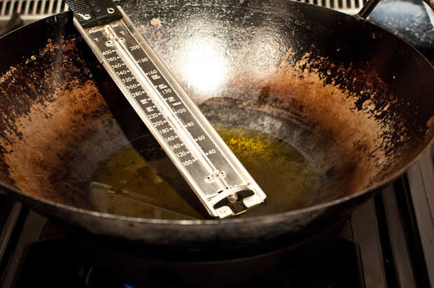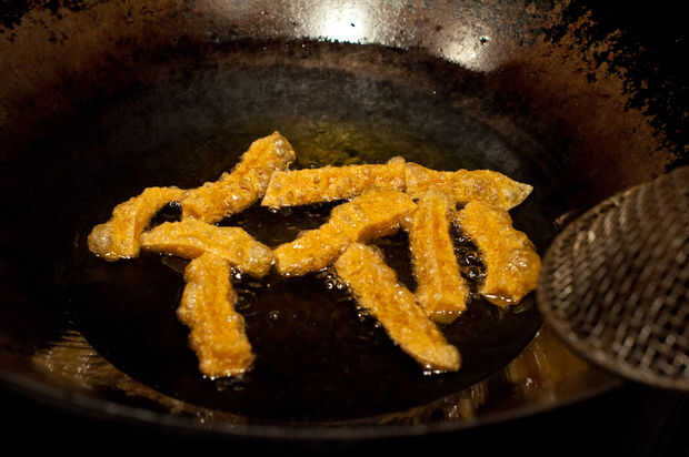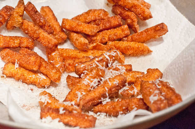 OK, así que ahora tienes poco palos de naranja que podría romper un diente y como algo que se desprendió de un juguete. Tiempo para jugar con fuego! Usted se necesita aproximadamente 2 tazas de aceite. Utilicé aceite de maní y canola trabajaría demasiado. Me gusta usar mi wok para freír, ya que tiene un montón de superficie para atrapar las salpicaduras y no usa tanto aceite como una olla a un lado recta. Calentar el aceite a 365 grados f el. Fry 8-10 palitos en un tiempo de aproximadamente un minuto a un minuto y medio. Revuelve con un colador o unas pinzas para voltearlas para freír uniformemente. Retire del aceite y escurrir sobre una toalla de papel. Espolvoree inmediatamente con sal y chipotle en polvo (si te gusta un poco de calor) y decore con queso parmesano adicional.