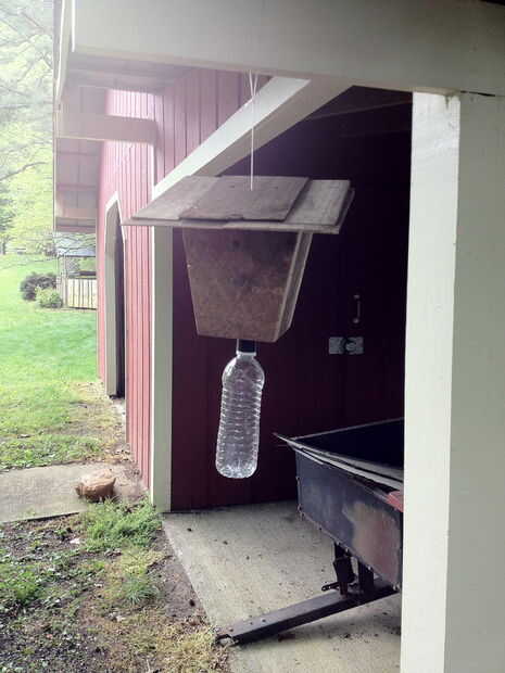 La trampa es una simple caja de madera con 1/2 agujeros perforados en los 4 lados en un ángulo hacia arriba. Puesto que las abejas prefieren utilizar un agujero existente, estas trampas proporcionan el agujero que están buscando. Una vez dentro de la caja, las abejas vuelan hacia la luz y el final para arriba en la botella de agua plástica en la parte inferior. Dos cosas que he visto mencionadas en línea fueron que estas abejas como un techo sobresaliente y un lado oblicuo a la caja. He incluido estos elementos de diseño, proporcionando un techo de gran tamaño y 2 lados de la caja de pesca.