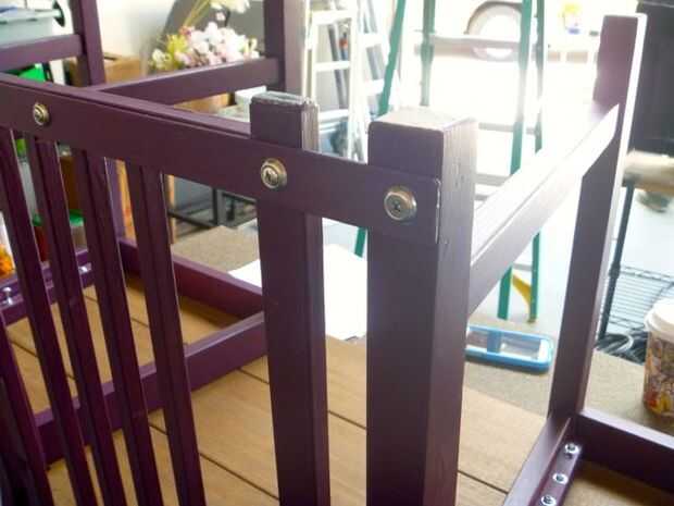 Sujete juntas a sillas con tornillos. Para un banco al aire libre, utilice herrajes de acero inoxidable, no oxida ni mancha si la madera se moja.