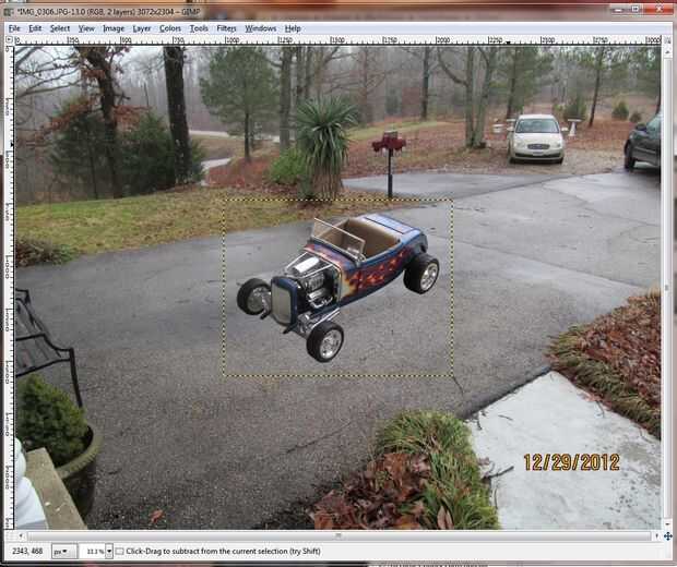 Seleccione "Archivo" para abrir la imagen de entrada vacante, o arrastre la imagen en el cuadro de imagen. En el cuadro de imagen, seleccionar "Pegar" en el menú desplegable, seleccione "Editar". La imagen del coche debe aparecer ahora en la foto de la entrada. Porque el fondo gris a cuadros de la imagen pegada era transparencia, desaparecerá. En la caja de herramientas de Gimp selecciona la "herramienta mover" y se trasladó la imagen pegada cerca del centro de la calzada. Ahora en la "herramienta de escala" en la caja de herramientas, haga clic en la imagen pegada. Aparecerá el cuadro de pequeña escala. Eslabones de la cadena aparecen rotos entre el "Width" y "Height", haga click en el centro de los eslabones de la cadena para conectarlos juntos. Esto permitirá de igual anchura y altura escalando. Haga clic en la flecha desplegable en el cuadro de escala para seleccionar "Por ciento" como el método de escalamiento... Ahora haga clic en la flecha "Arriba" en caja "Ancho" o "Altura" y mantenga presionado. La imagen pegada debe empezar a aumentar. Una vez que parece que es "lifesized", que quizás tenga que volver a utilizar la "herramienta mover" para volver a colocar el coche.