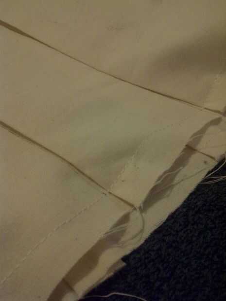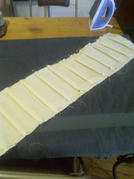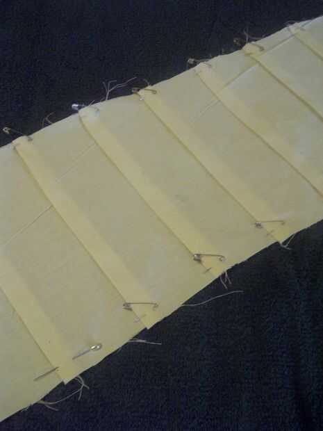 Ahora creamos los pliegues. Para cada pliegue habrá tres marcas; doblar en la segunda marca para que el tercero descansa en la cima de la primera y pin en su lugar. Si esto no tiene sentido, mis fotos y leído a la guía vinculada.