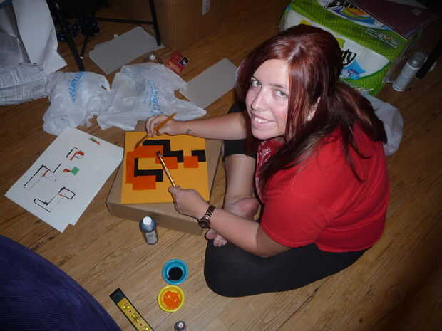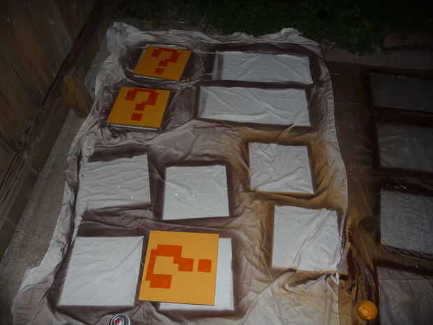 Crear una plantilla de cartulina en forma de la interrogación de Mario y cortar con un cuchillo del exacto. Hacer una plantilla adicional de contorno negro alrededor de la interrogación. La pintura naranja el signo de interrogación y el contorno negro.