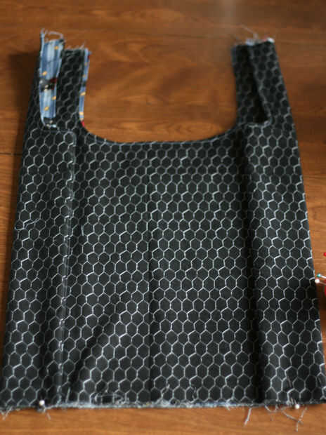 Gire la bolsa de adentro hacia fuera para que la tela de la guarnición está en el parte exterior. Para hacer los refuerzos, doblar los lados de la bolsa más hacia el centro como se ilustra. Pasador de la parte inferior para que no resbale al coser. Podría parecer contraintuitivo para doblar la bolsa de esta manera pero cuando la bolsa de la derecha y empujar las esquinas hacia fuera, usted tendrá refuerzos perfectos. Tenga cuidado de doblar por lo que las asas se doblan apenas tímido de la mitad del recorrido. Si haces los dobleces demasiado grande, el interior esquina de la bolsa se mostrará en la parte superior. No una tragedia, pero irritante y goofy buscando si eres un perfeccionista como yo.