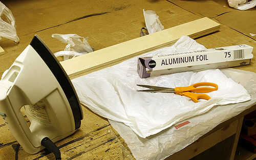 Se necesita una tonelada de bolsas. Creo que conté 30 bolsas en el momento en que estaba hecho con el bolso de mano. Se necesita una plancha que se puede establecer a temperatura baja y unas tijeras, papel de aluminio y algo dura y plana. He utilizado madera contrachapada.