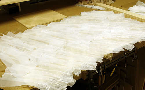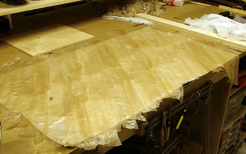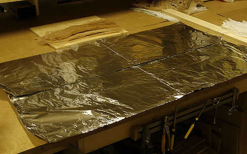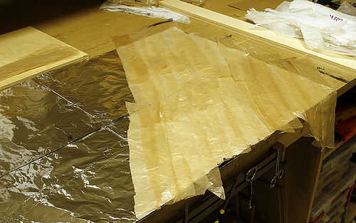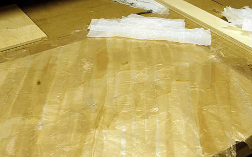 Inicio establecen su primera capa diagonalmente sobre el chapaleteo las tiras a medida que avanza. Usé bolsas de cafés para mi primera capa porque tenía una superabundancia de ellos.