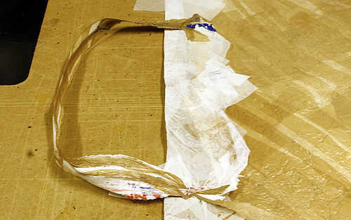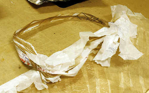 I meter los extremos sin fundir de la manija en los extremos del ciclo del borde y coloque una hoja de papel sobre el área y el lechón con el hierro del fusible.