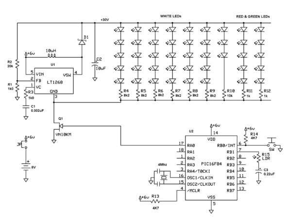 Es esencialmente un convertidor DC-DC y un PIC 16F84 (o PIC 16F88) para manejarlo.