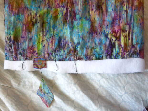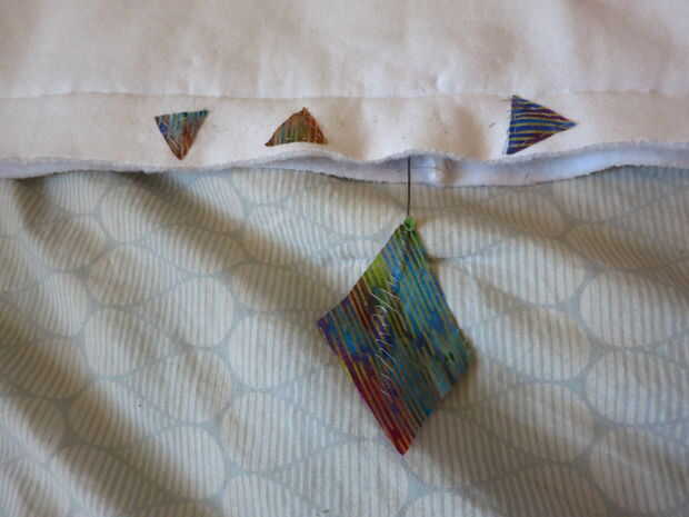 he decidido crear un botón que toca esencialmente los dos trozos de hilo conductor junto (el más largo con la tela de forma de diamante grande es la tierra y los pequeños triángulos son cada uno de los tres gatillos). Sólo tienes que hacer contacto entre el gran diamante con uno de los temas para un momento desencadenarlo (Do no sostiene los pedazos de hilo junto por mucho tiempo o no funcionan bien). Debido a la forma el Lilypad Mp3 está programado, cuando tocas un botón"nuevo" o el gatillo, se detiene la pista anterior y a emprender esa nueva pista.