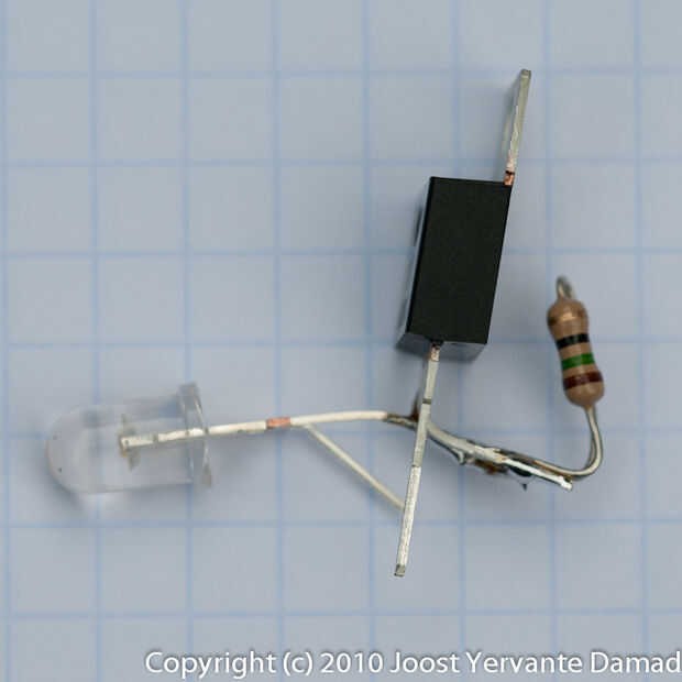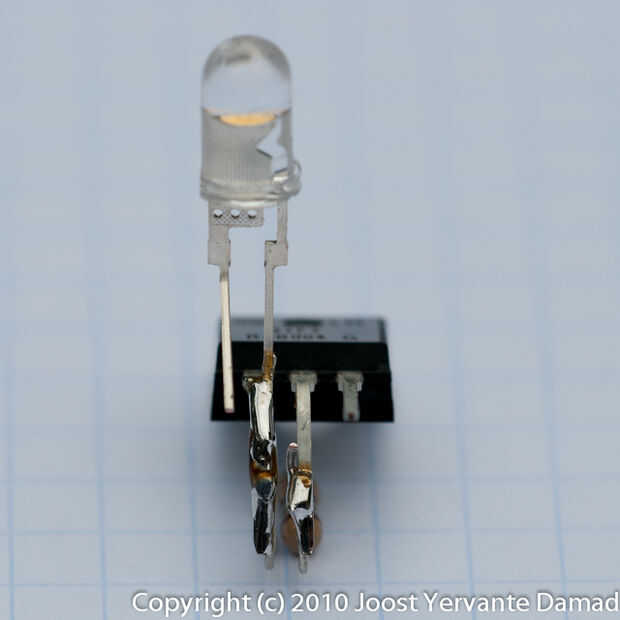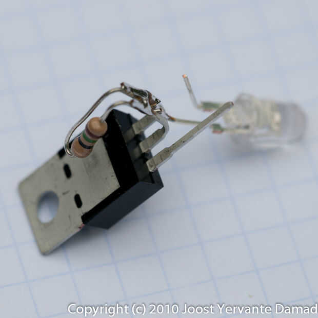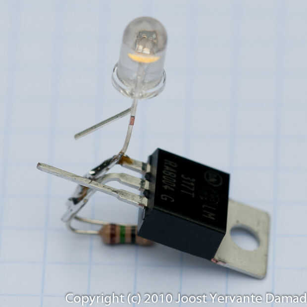La resistencia de la curva y soldadura en el ajuste y pines del LM317 y soldar el LED con su largo liderazgo en el perno de ajuste.