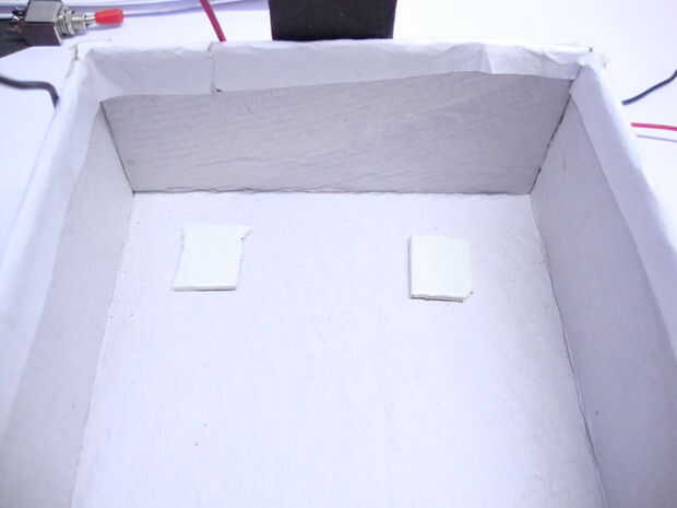 Palillo de la batería a la caja usando cinta de doble cara. Asegúrese de que es fácil cerrar el cuadro y hay suficiente espacio izquierda.