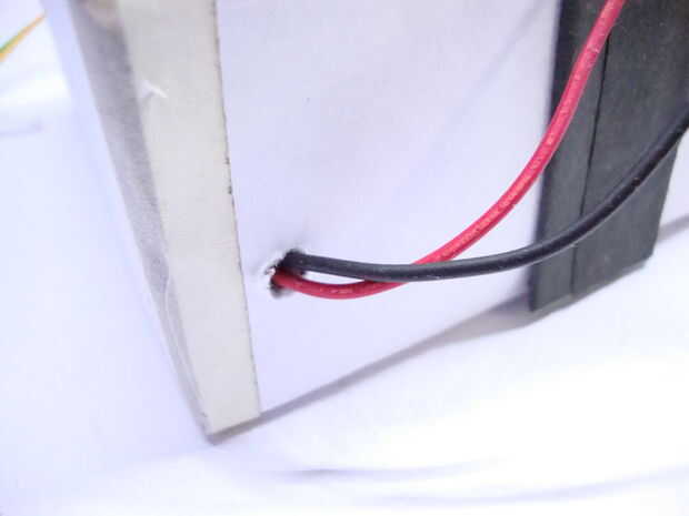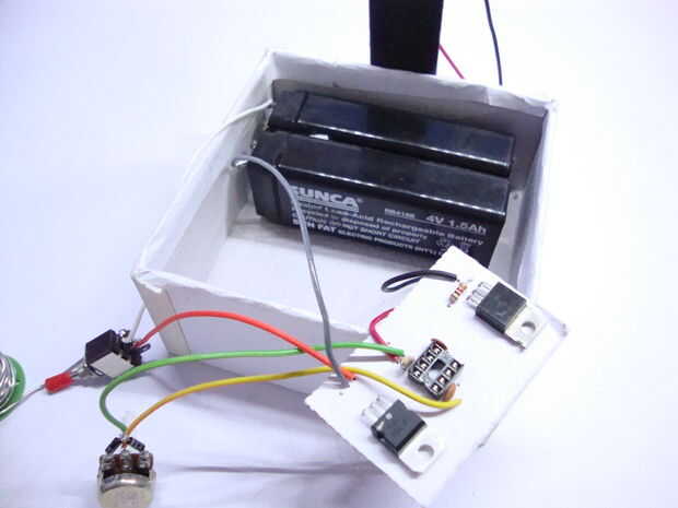 Hacer un agujero en la parte posterior de la caja y pasar los cables del led a través de los agujeros. Luego conecte el positivo del led al pin 8 del ic y el pin negativo de condujo al colector del transistor.