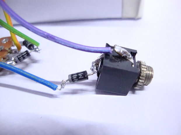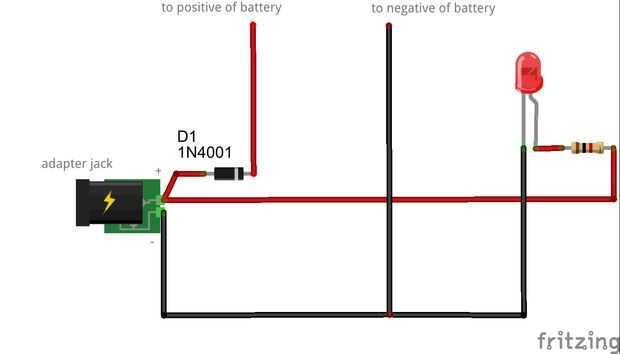 Un diodo está conectado al conector de adaptador para que el led de carga se ilumina sólo cuando un adaptador está conectado pero no encendido cuando la lámpara se enciende. Conecte al conector adaptador a los terminales positivo y negativo de la batería.