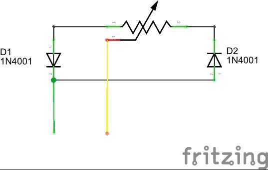 La razón por qué este paso es lo primero es que será necesario para prototipos el circuito que es el siguiente paso. Soldar dos diodos como se muestra en la imagen de arriba y soldar dos cables más - uno en el pin central y el otro en el punto donde están conectados los dos diodos.