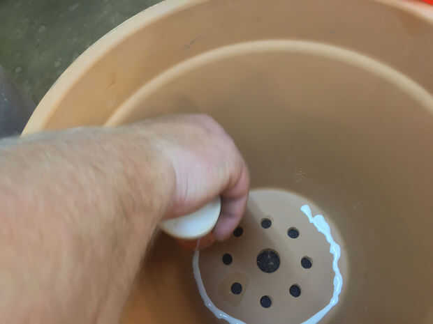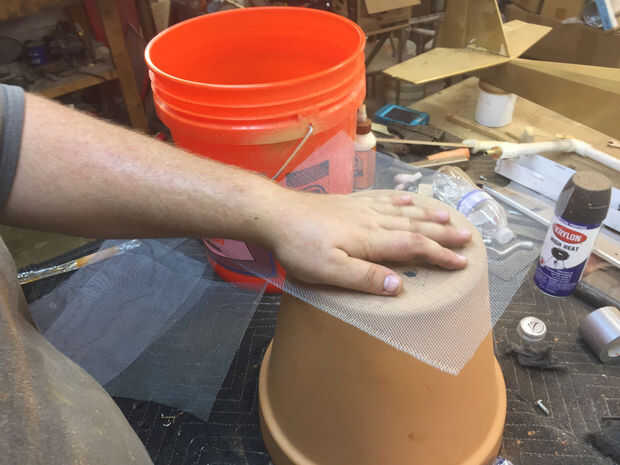 Toma una hoja de malla de metal y colocarlo en la parte inferior de su contenedor más pequeño. Lo hicimos colocando la malla en el fondo de la olla y cortar alrededor de ella. Corte varias hojas de malla porque se les va en capas. Cuando ha cortado sobre 3-4 hojas del mesh, levante el lado derecho del bote y la malla en la parte inferior de la capa. Nos usa pegamento para fijar la malla en su lugar, pero no tienes las cenizas deben fijarlo a la parte inferior adecuadamente.