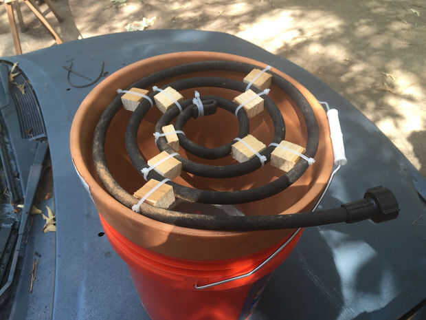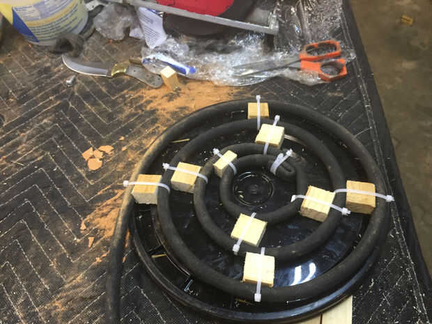 Tome un pedazo de soaker manguera (también conocido como manguera de jardinería) y enrolla en una bobina circular que es aproximadamente el diámetro de la tapa del pote de arcilla. Uniformemente espaciados y había asegurada nuestra bobina por zip atar pequeños bloques de madera a lo largo de él. El bobina terminado debe parecerse a la tercer foto aquí, la idea de la bobina es sólo para asegurarse de que el agua es distribuida sobre las cenizas.