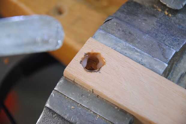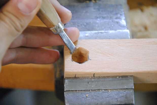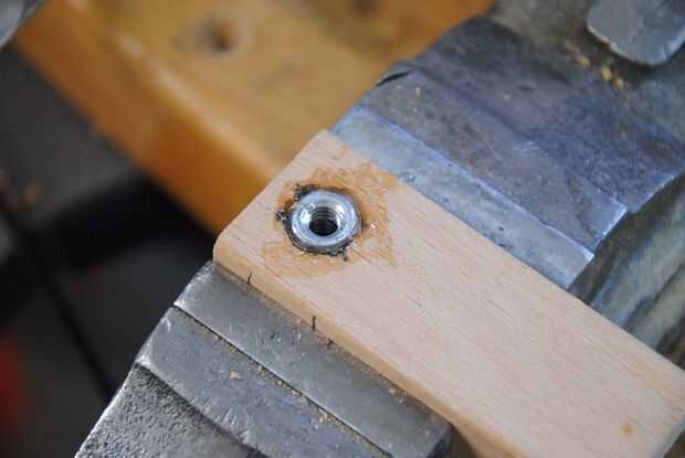 Después de eso, solía un 5mm cincel y mazo de madera caseros mi cincel la forma de la tuerca en la madera. La profundidad del agujero debe ser cincelada a la altura exacta de ambos de las tuercas de maleficio cuando están apilados uno encima del otro