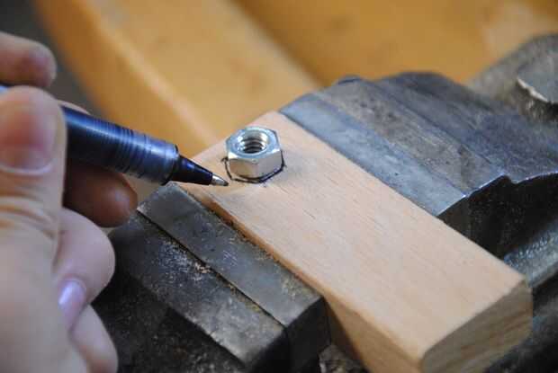 Empezar marcando el contorno de una de las tuercas hexagonales (porque son ambos idénticos) alrededor del agujero. Asegúrese que la tuerca hexagonal está centrada exactamente sobre el orificio