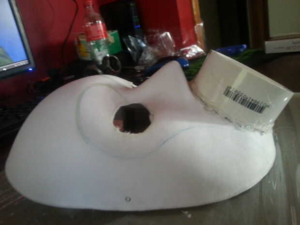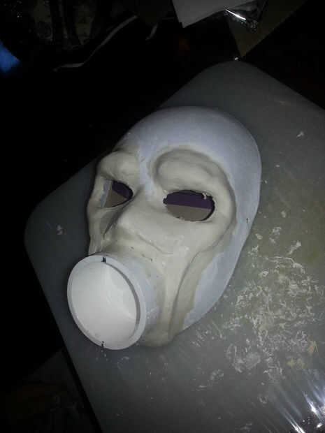 Después de cortar su frente a la longitud correcta, luego sería cortar la boca así que la pieza de fontanería puede caber en él. Tenga en cuenta, no quiere forzar la pieza en la máscara, así que tardará un poco de afeitado con el bisturí, por lo que cabrá. Asegúrese de que su centro!