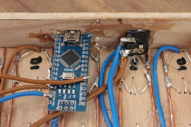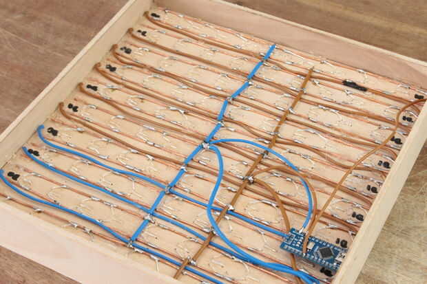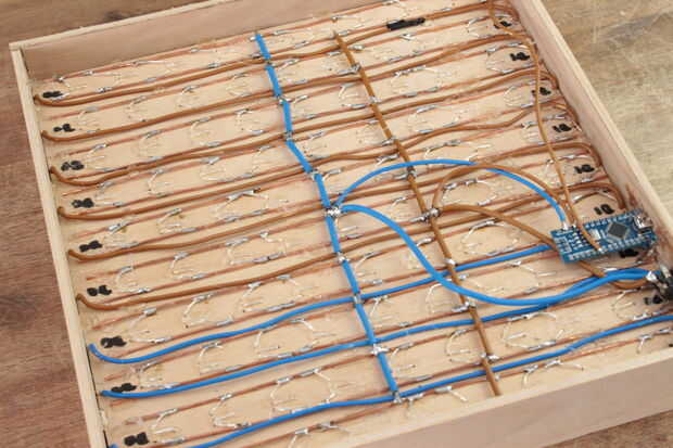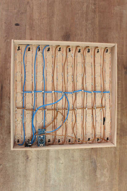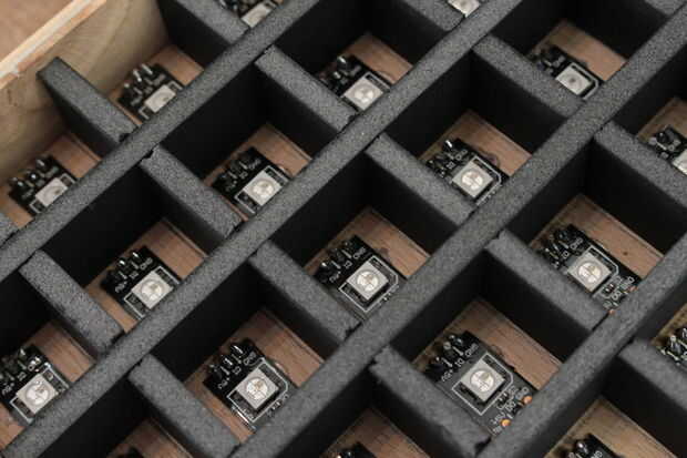 Primero apagado es necesario crear la red de Junta de espuma (ver fotos adjuntas). Entonces necesitas dos 24.5x24.5 cm cuadrados de madera de haya contrachapada y uno de vidrio acrílico. La última parte de la caja son los lados. Elegí unas dimensiones de 4.8x25.5 cm. Usé el centímetro extra para crear patrones de rectángulo en ambos extremos de cada lado para juntos. El resto de la construcción del caso y el cableado se explica en el video.