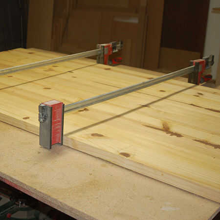 4. después de dejar por una hora o dos, fue vierte pegamento en las ranuras opuestas y todos los tablones ranurados juntos. Puede que necesite un mazo de goma en mano cuando se unen los tablones juntos para darles un poco de ayuda. Sujeta toda la mesa con mi Bessey pinzas durante la noche. Si no tienes monstruos como éstos en su taller, coloque algo pesado en cualquiera lado espera todo juntos mientras el pegamento seca.