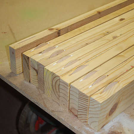 3. corte cuatro ranuras a lo largo de la longitud total de cada tablón. Después del corte, se colocaron las tablas con las ranuras hacia arriba, cola para madera en las ranuras y las galletas que se inserta. Éstos quedaron entonces para conformarse con un par de horas.