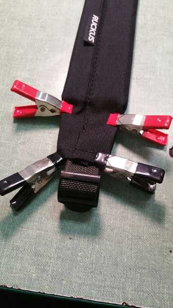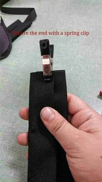 Paso 7. pellizcar los bordes de la parte inferior en forma trapezoidal, inserte las correas y los ajustador de la correa y asegure con clip de resorte.