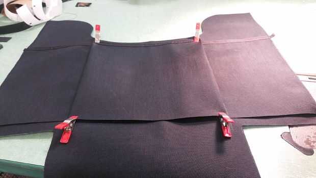 Paso 4. Usted debe ahora dejarse con exceso de tela en el centro entre las marcas de 2 tiza. Ahora usted puede pellizcar la parte inferior la que se superpone con la tela sobre sí misma creando un pliegue de tipo acordeón. Asegúrelo con una abrazadera de resorte y hacer lo mismo en el borde superior asegurándose de que corren paralelos. Repita en el lado opuesto. El bolsillo se debe ahora relativamente enseñar contra la pieza frontal segura por los 4 clips de resorte.