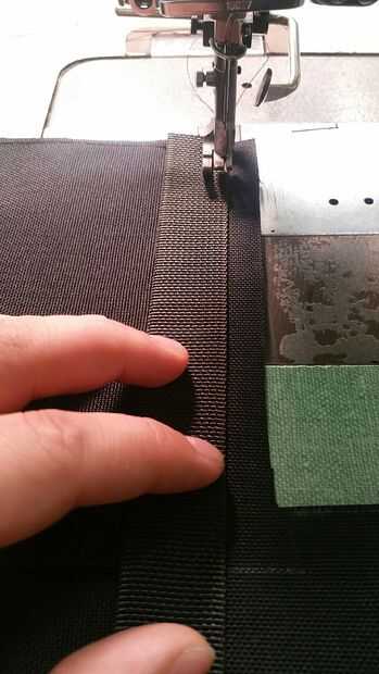 Paso 1. Se unen el borde superior de la bolsa con cinta de grano grueso o material de ribete. Puede utilizar una carpeta como en la uno foto anterior o utilizando una baja temperatura en una plancha, plancha la cinta por la mitad, el perno hasta el borde y luego coser. Realista la cinta se puede incluso doblar a mano si tienes la paciencia. Si no te importa el bolsillo está más corto doble podría rodar la parte superior y dobladillo allí. Prefiero hacer esto para las telas que pueden plancharse con una plancha como lienzo.