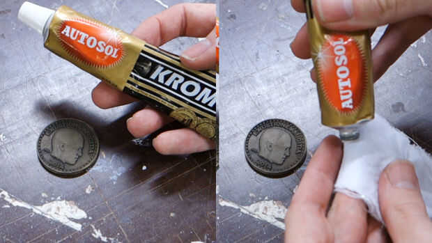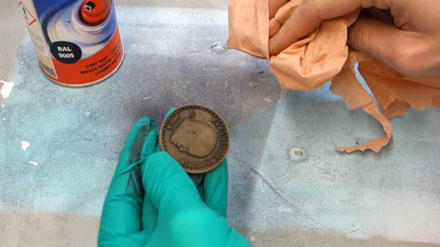 Paso final y aquí es donde entra la magia. Una vez que la pintura haya secado completamente, tome algunos pulido metal compuesto, como el Autosol y pulir los puntos altos de la moneda. Esto traer el brillo y dar una pátina bonita, varias capa, en tu moneda. La oxidación quemada brillará a través de lugares, y la pintura de aerosol negra permanecerá en lo más recóndito.