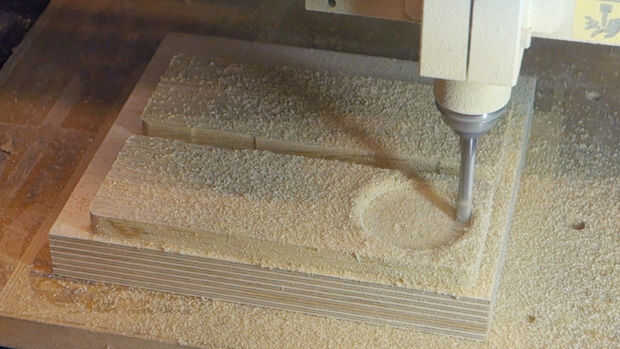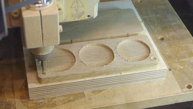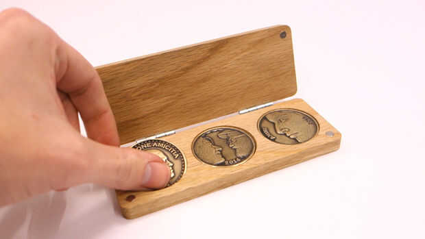 Aquí estamos utilizando una pieza de roble, cortada por la mitad y abrió así coincidirá con cada lado de la caja cerrada. En esto tres hendiduras para monedas fueron molidos, cada uno una fracción más grande que la moneda real para que no se unen en sus posiciones. La parte frontal de los nichos eran molido ligeramente más profundo que el resto por lo que las monedas pudieron extraerse fácilmente presionando la parte delantera para que la parte posterior de la moneda aparece.