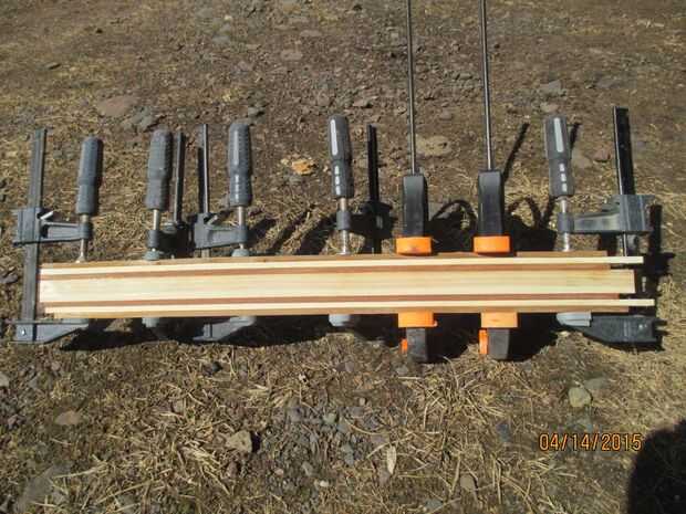 Estaba usando tiras de distintos colores de madera de cedro para la lámina, alternando colores claros y oscuros haciendo rayas. Para uno, que tenía un montón de cedro para trabajar con 2 º... laminando varias piezas juntas para hacer una tabla es menos probable que la deformación y fractura comparado a la talla de las hojas desde una placa única, sólida. Pero... el cedro es una madera muy flexible, no se sostendría hasta el abuso a la paleta tendrá y probablemente rompería fácilmente. Tuve mucha fibra de vidrio y epoxi sobrante de la canoa, por lo que cubrí mi paleta terminada con que para la fuerza, la alternativa a fiberglassing sería hacer las cuchillas de una madera dura, o usar unas tiras de madera dura en el diseño para dar rigidez a la hoja y utilizar tiras de madera duras en los bordes más externos, que es donde las paletas más atontadas y golpeó en el. Mi paleta estaba cubierta con epoxy, usé pegamento de madera regular. Si la pala es sólo conseguir revestida con barniz, entonces necesitarían un pegamento para madera resistente al agua.