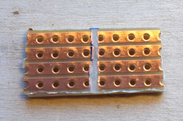 A continuación, del lado cobre, ligeramente corte una ranura hacia abajo de la media a través de la capa de cobre sólo para que su 4 filas ahora son 2 columnas.
