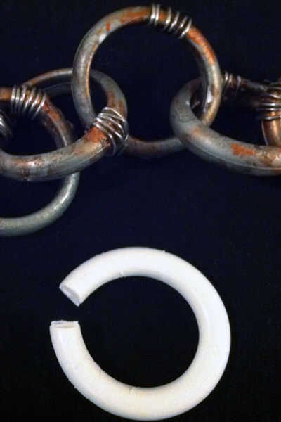 Los anillos de cortina de ducha van a ser un poco demasiado grande, por lo que tendrá que cortarlas. Cortada fuera del abertura/cierre del anillo con alambre cortador tijeras para chapa (que utilizo para el alambre de corte chainmaille anillos). ¿... Podrías utilizar unas tijeras de trabajo pesado o cuidadosamente con una sierra para metales o tal vez una sierra de banda?
