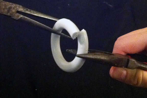 Cuidadosamente (usar guantes o guantes!) Retire el anillo del horno. Usando dos pares de alicates, gire el anillo al aire libre extremos sobre el regazo. El plástico es caliente, le permite modificar su forma - sin embargo saltará hacia atrás un poco, por lo que están superpuestos los dos puntos. Mántengalo en esa posición durante un buen 5 minutos. Usted puede encontrar que usted necesita para poner en el horno de recalentamiento y rebend.