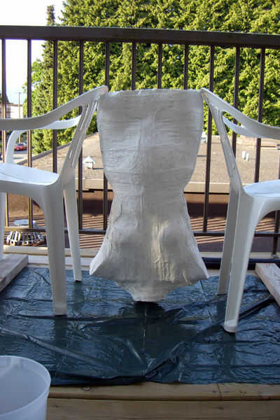 Mi esposo y yo hecho un molde de escayola de mi cuerpo, como lo hemos hecho de mi cabeza previamente; después de ser cubiertos en vaselina, la parte posterior de mi cuerpo estaba cubierta de 4 capas de tiras de yeso de París, abundante vaselina fue agregado a los bordes laterales para evitar que la mitad delantera se adhiera a él, luego se agregaron las capas delanteras y ambas piezas se retiraron una vez secos
