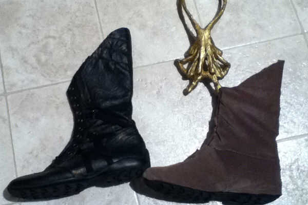 Empecé con un viejo par de botas de invierno. Te recomiendo conseguir un par que puede resbalarse (como una bota de cowboy o vaquero). Ya que originalmente mío atado para arriba, cosí un elástico a través de la apertura, después de cubrir con la tela frontal.