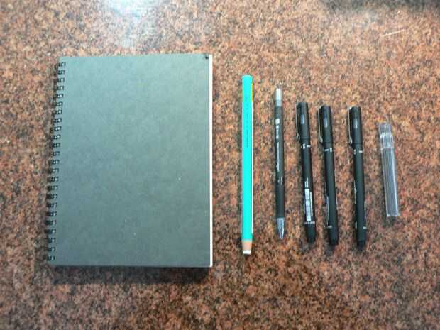 Primero, compra un libro del bosquejo con el peso del papel de su elección.  He escogido 200 #rough papel acuarela desde lápiz y tinta con planes para más tarde acuarela lavado de color.  Luego colocar las herramientas que desea añadir a la libreta.  He elegido tres UNI-trazadores de líneas (no riesgo mis Copic los trazadores de líneas al exterior!) un lápiz mecánico de .5m m y cubierto de un lápiz mecánico de 2,0 mm con una caja de plomos (el lápiz de 0.5mm tiene su propio soporte de plomo donde como 2.0m m lápiz tiene solamente uno internamente) y un papel borrador blanco largo.