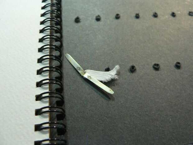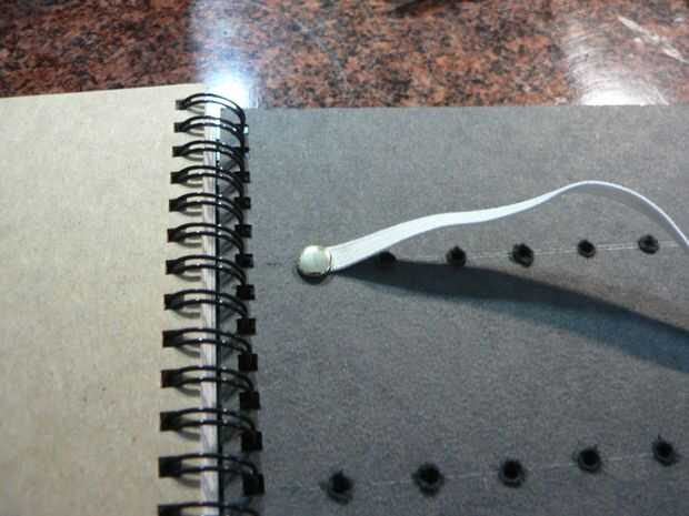 Ahora, utilizando sujetadores de papel de latón número 8 que todos utilizamos en jardín de infancia para hacer molinetes (¿qué? no?) vamos a sujetar la punta hacia abajo.  Presione el sujetador a través del orificio, estirar las piernas mientras se tensa fuertemente para traer una buena fricción sostenga a la cinta elástica.
