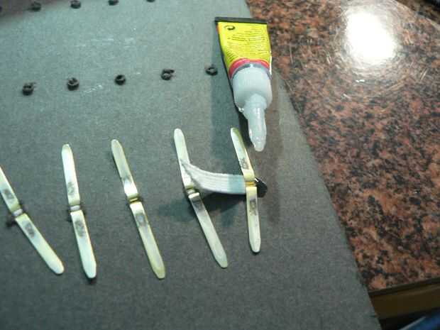En el último agujero de la línea del hilo de rosca la cinta entera a través del orificio de manera similar a la primera. Garantizar su sujetador de latón y entonces, sólo para la diversión y la posibilidad de que los gases, golpeó la parte posterior de los sujetadores y cintas con unas gotas de mi favorita aromaterapia; Pegamento estupendo! (No niños, realmente... que era una broma... no le pegues con pegamento, pero no es para oler)