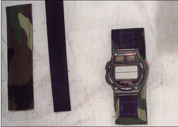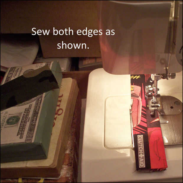 Para comenzar, cosí la pieza de retención de material a la pieza de la banda.  Está asegurado en ambos extremos para que tenga un circuito cerrado para que se sujete el reloj con las barras de resorte. Para la venda sí mismo, doblé el material más 1/4 de pulgada en un extremo. Doblé el otro borde más 1/4 de pulgada, así. Hice esto para que ningún borde de frazzeled mostrando, y se deja suficiente espacio para insertar el elástico a través del "túnel" creado por coser a ambos lados de la banda en sólo un poco menos de 1/4 de pulgada en cada lado de la banda para mantener balance.