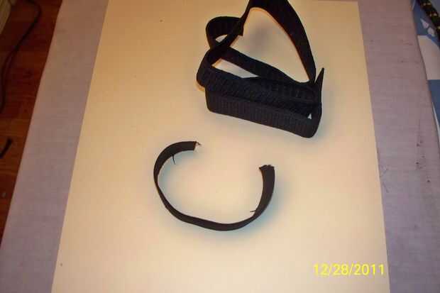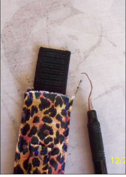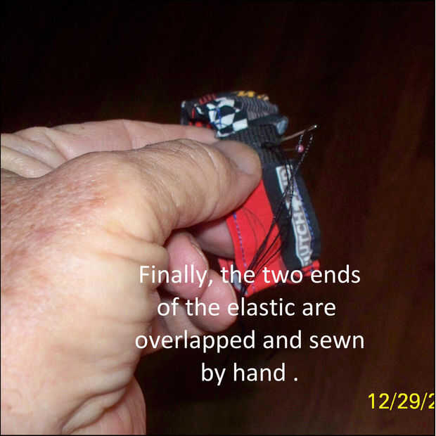 La tira elástica se "pescan" a través de la venda de reloj. Utilice un taco embotado o una herramienta de selección dental como se muestra.  Los extremos del elástico están comprometidos 1/4 pulg, cosida a mano.