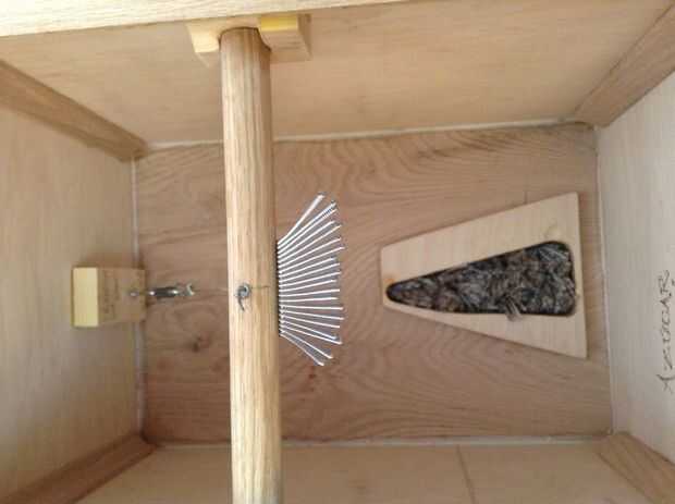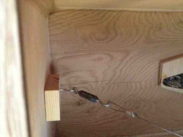 El tercer bloque va a ser pegado al "techo" de la caja, pero primero debe hacer un agujero piloto en el centro donde irá el gancho. Es crucial perforar el agujero piloto para que la madera no divide cuando atornille el gancho. Este bloque con el gancho en ella hacia la parte posterior de la caja, centrada, el pegamento y colgar su tensor pequeño del gancho. Ahora tenemos que perforar un pequeño orificio en la clavija sólo grande suficiente para adaptarse a un 1/16" cable... debe estar en medio de la espiga a lo largo pero fuera del centro a lo ancho. Cuando alimenta un cable a través de agujero y tire hacia arriba hará que la espiga quiere rodar hacia adelante, presionando la trampa contra la tapa. Así que alimentar el alambre en el orificio de abajo hacia arriba a través de la parte superior y cada lazo un nudo o una férula en la parte superior de la encrespadura. El otro extremo del cable tiene un bucle, así que puso su virola en el alambre y lazo alrededor pero antes de prensar figura la longitud colocando el lazo para el tensor (aflojar el tensor mucho para empezar por lo que se puede apretar más adelante para agregar tensión). También, lubricante a las roscas en el torniquete por lo que resulta agradable y suave, hace más fácil de ajustar sobre la marcha alcanzando en a través de la boca.