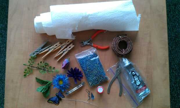 b. todo lo que te inspira para hacer su pinza de pelo, en este ejemplo es flores falsas, una mariposa de plumas, perlas, pendientes upcycled y falso verdor.