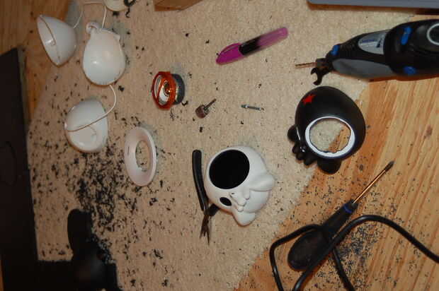 3. mientras estamos aquí, saque esos altavoces de Philips y desmontar esos mamones. Hay tres tornillos en cada altavoz de la vivienda. Una vez que estén abiertos, puede eliminar otros tres tornillos y luego levante el altavoz de la caja. Prueba que caben en el ojo. Usted notará que hay una pequeña muesca en el altavoz. Taladro de la esquina de la cuenca del ojo para adaptarse a esta muesca.