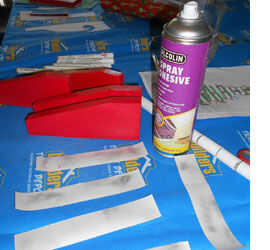 Colocar una hoja de periódico y rociar la parte posterior de tus franjas de corte con adhesivo en aerosol Alcolin. También debe rociar ligeramente la parte inferior de cada pie donde el papel de embalaje a respetarse.