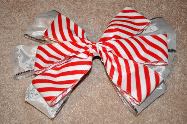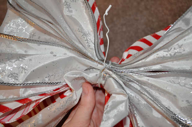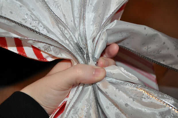 Tomar el más pequeño, ya aseguró el arco y poner en la parte superior. Ahora puede envolver su ligadura con la otra mano sobre el frente de ambas secciones de proa. (Lo siento por no conseguir mejores fotos; No pude hacerlo sin una tercer mano!)